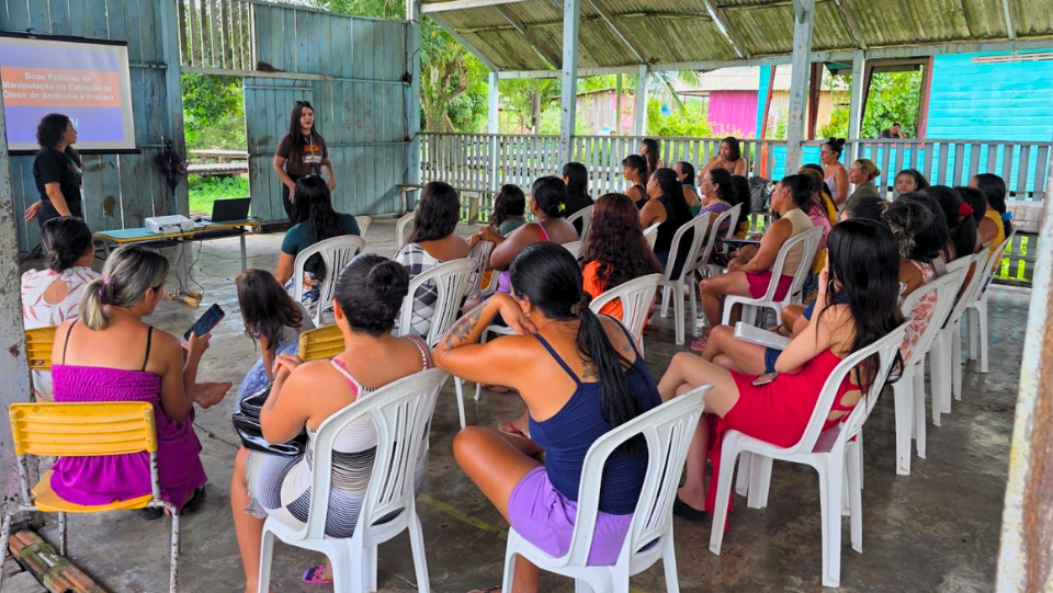 Durante a programação, a equipe técnica da instituição promoveu um treinamento sobre boas práticas na manipulação de óleos vegetais, a fim de qualificar os processos produtivos e contribuir para a melhoria da qualidade e a agregação de valor aos produtos da sociobiodiversidade amazônica. A atividade atendeu cerca de 25 pessoas e foi direcionada às integrantes da Associação de Mulheres Extrativistas do Limão do Curuá (Amelc).